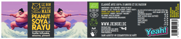 L'interprétation du Rayu par J.Kinski contient de l'ail, des oignons de printemps et du gingembre. Le tout est accompagné harmonieusement de graines de sésame grillées, de morceaux de cacahuètes croquants et de graines de soja fermentées. Les algues wakame et les champignons shiitake apportent la cerise umami sur le gâteau.